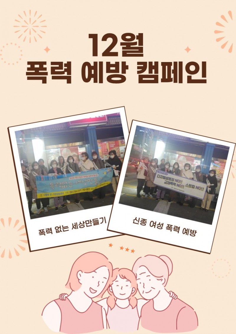 2025년 12월 폭력예방 캠페인 실시 페이지 정보 작성자 최고관리자 작성일25-12-31 14:01 조회25회 관련링크 다음글 목록 본문 2025년 12월 3일(수) 수영역 인근에서 본센터 직원들과 자원봉사자들과 함께 "신종여성폭력예방" , "폭력 없는 세상만들기" 캠페인 활동을 하였습니다. (홍보물품 배부 활동) 많은 관심 가져 주셔서 감사합니다~~^^ 다음글 목록